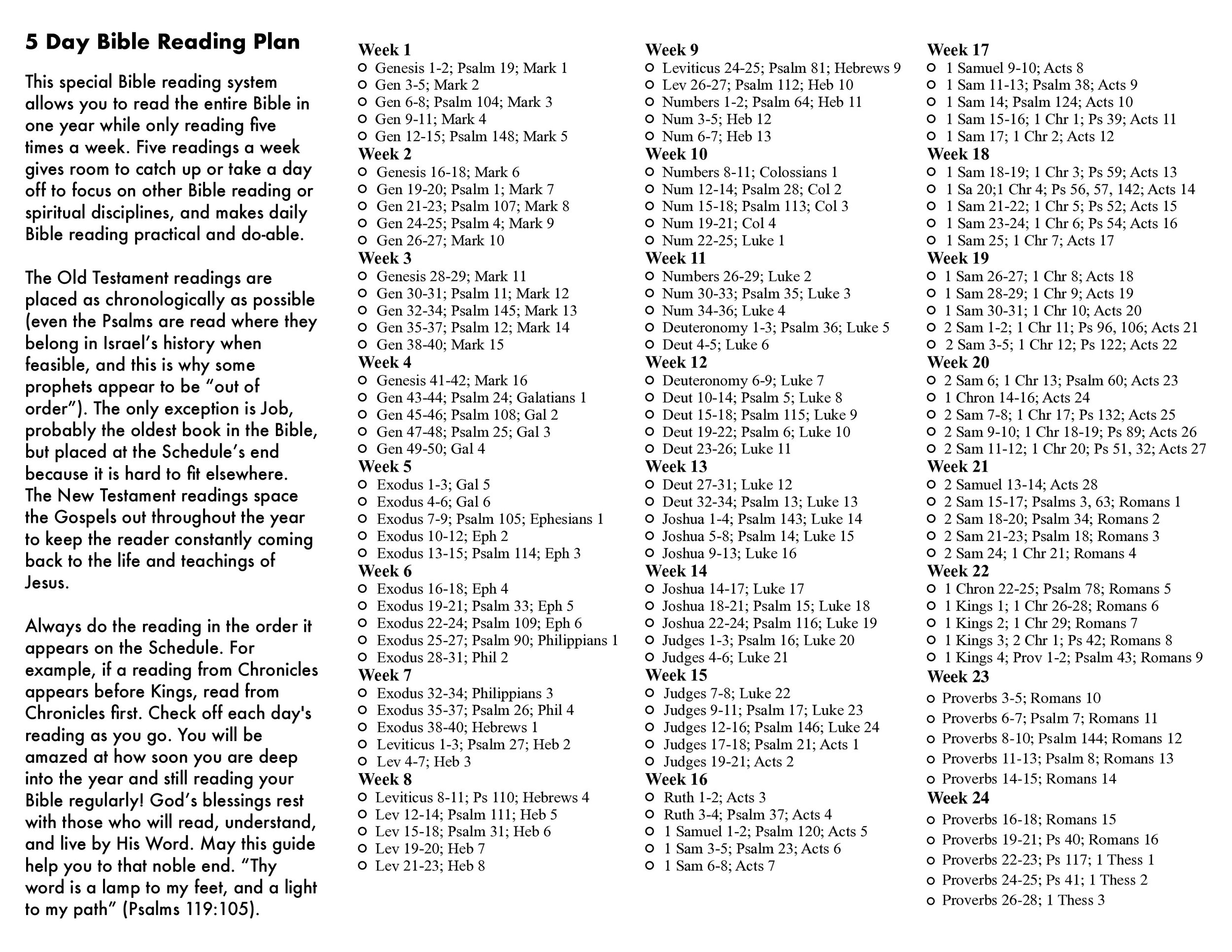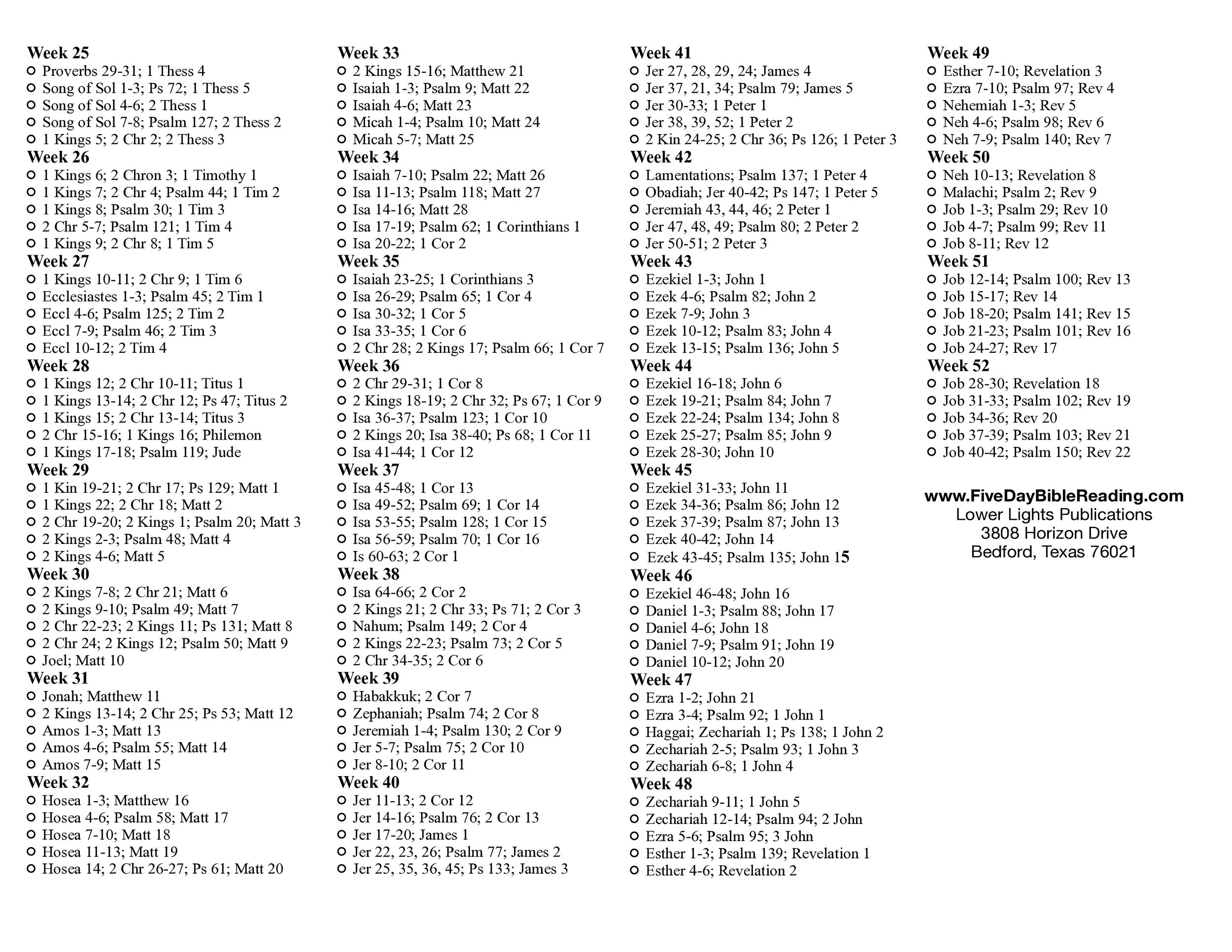 For 2026, we are taking part in the Five Day Bible Reading Program. Here we will read through the Bible chronologically, Monday through Friday with weekends off. You can follow the list below, grab a copy in the foyer, or download a list of your own. Here’s the link: 2026 Bible-in-A-Year. It will be an exciting time in God’s Word together. Don’t forget to share your experience with other believers. Tell someone about your commitment and hold each other accountable. God Bless church family.